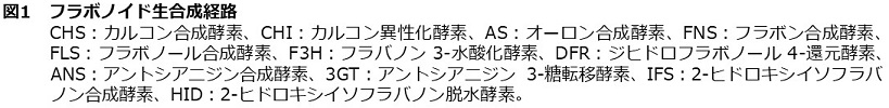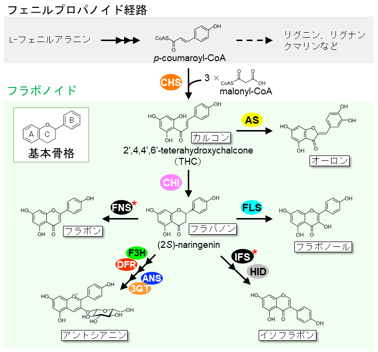 フラボノイドは陸上植物 (コケ植物、シダ植物、裸子植物、被子植物) において普遍的に生産される植物特化代謝産物の一群である。C6-C3-C6の共通の基本骨格を有し、C3部分 (C環) の構造の違いに基づきカルコンやイソフラボン、アントシアニンなどのサブクラスに分類される (図1)。これらフラボノイドは、水酸化や配糖体化、アシル配糖体化、メチル化、プレニル化など多様な修飾を受け、主に植物細胞の液胞に貯蔵される。植物種の違いや蓄積する組織、生育ステージなどに応じて、結合する糖の種類や位置、アシル化、メチル化などの修飾が異なる様々な形のフラボノイドが存在し、これまでに7000を超える構造多様性が知られている1)。植物におけるこれらフラボノイドの機能は多岐にわたり、例えばアントシアニンは、赤色~青色の花色の呈色物質として受粉媒介者の誘因に寄与する。一方、ダイズなどのマメ科植物に含まれるイソフラボンは、病原体に対する抗菌物質として機能するとともに、根から分泌されるイソフラボン類は共生微生物である根粒菌の誘引物質としても機能する。このように、フラボノイドは植物の生殖や環境適応に重要な役割を果たし、多様な植物の生存戦略に必須な化合物群となっている。