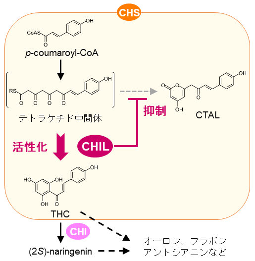 次に、CHILがCHSの活性に与える影響が解析された。その結果、CHILはCHSの活性を大きく増大させることが示され15)、さらにCHS反応により生じる副生成物 (CTAL) の生成を抑制することが明らかとなった6,16) (図4)。したがって、CHILはCHSと相互作用することでCHSの生成物特異性のあいまいさを“矯正”し、フラボノイド初発物質であるカルコン (THC) を優先的に生成するように作用することが明らかになった。さらに、このCHILによる活性制御は陸上植物に進化的に高度に保存されていることが示され6)、陸上植物における効率的なフラボノイド生合成にはCHSとCHILの相互作用が必須の役割を果たしてきたことが示唆された。