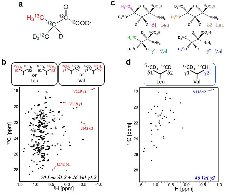 また、図1aのα-ケト酸はメチル基の立体特異性を保持していない。そのため、得られる蛋白質中のLeu残基及びVal残基の各メチル基への13CH3導入率は最大でも50%が上限となる (図1b上段)。この場合、微量な蛋白質に対しては1H-13C HMQCスペクトルでは十分な感度を得られないばかりか、メチル基間の距離情報を得るためのNOESYスペクトルではさらなる感度低下を引き起こし、構造動態解析に困難を生じる。標識率の低減を克服するため、異なるアミノ酸前駆体を利用する手法も開発されているが8)、立体特異的およびアミノ酸残基特異的な安定同位体標識は不可能である。