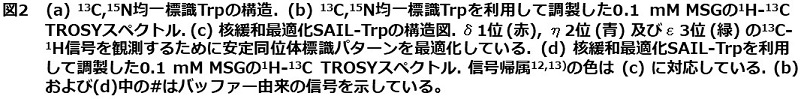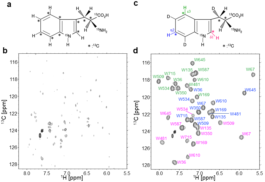 一方で、芳香環の13C-1H NMR信号の高感度観測や立体特異的かつアミノ酸配列特異的な信号帰属は、分子量10 kDa程度の蛋白質でも容易ではない。この原因として、芳香環構造内における磁気的相互作用の影響が大きいことが挙げられる。実際に、13C,15N均一安定同位体標識を施したTrp (図2a) を用いて調製したMSGについて、1H-13C TROSYスペクトルを測定した。この試料では、MSG中のTrp残基のみが1H,13C,15N標識され、そのほかのアミノ酸残基は均一に2H,12C,14Nで標識しており、Trp残基周囲からの核緩和の影響を抑えている。それにも関わらず、Trp残基インドール間の13C-1H 相関NMR信号は、ほぼ観測されていない (図2b)。つまりインドール環内の1Hおよび13C核間で働く核緩和機構がNMR信号の低感度化に大きく影響を与えていることがわかる。そこで我々は、Trpインドール環内の安定同位体標識パターンを改良することで、核緩和機構の最適化を行うことにした。
