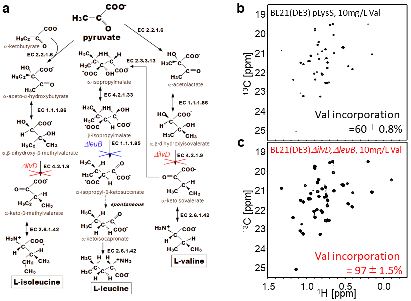 一方で、大腸菌のアミノ酸生合成過程の問題上、アミノ酸の種類によっては、代謝拡散によって、目的外のアミノ酸にも安定同位体が標識されてしまうことがある。また、添加したアミノ酸が、目的蛋白質へ効率よく取り込まれるために、添加量を十分に検討する必要がある。例えば、前述したLeuおよびValの場合、大腸菌の生合成経路においていずれもピルビン酸を出発点として合成されるが、Val生合成の下流でLeuが合成されている (図3a)。したがって、大腸菌培養培地にValを添加するとLeuも同時に安定同位体標識されてしまう。実際に、培地1LあたりにValを100 mg、Leuを20 mg同時に添加しないと、Valの目的蛋白質への取り込み率は90%を超えない9)。Val残基以外にも、Alaなどは生合成経路が多岐にわたるため、数百mgのAlaを加えても高い取り込み率を実現することは難しい14)。大量の安定同位体標識アミノ酸を利用することは、試料調製にコストがかかるため、発現量の少ない高分子量蛋白質への溶液NMR研究の応用に大きな障壁となる。我々は、目的蛋白質へのアミノ酸取り込み率の改善を図るため、ラトガース大の井上正順博士および石田洋二郎博士に協力を得て、アミノ酸要求性大腸菌株を調製した15)。