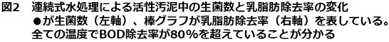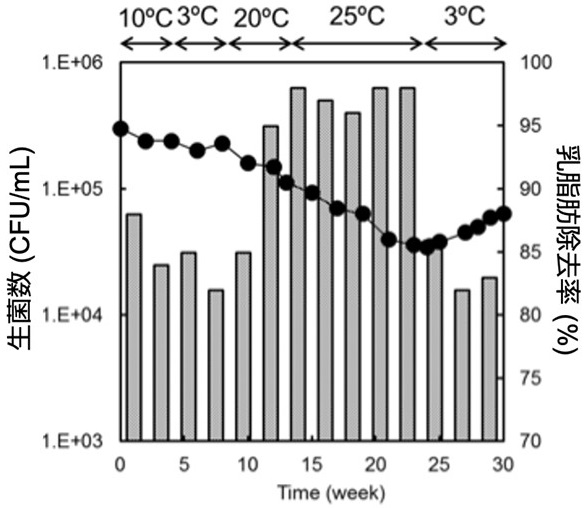 実際に北海道の酪農施設で利用されている活性汚泥 (通常の活性汚泥) と、通常の活性汚泥にSK-4株を添加した活性汚泥 (SK-4株入り活性汚泥) を10℃のバッチ式 (1つの槽内で、汚水投入、ばっ気、沈殿、処理水の排出を行う方法) でモデル酪農排水 (牛乳を基質として使用) の処理を24時間行った。その結果、SK-4株入り活性汚泥では、通常の活性汚泥と比べて乳脂肪除去率が約25%向上することが確認された12)。北海道東部の酪農排水は厳冬期で約3~4℃、盛夏期で20℃~25℃であるため、水温を3℃~25℃で変化させ30週間の連続処理実験を行った。SK-4株を25℃で11週間連続処理すると、SK-4株は初期菌数の約10%まで減少するが、死滅することはなく、水温を3℃に低下させることで再び増殖することが確認された (図2)13)。また、水温が3℃でも乳脂肪除去率は80%以上を維持したことから、SK-4株を利用した酪農排水処理システムは、北海道のような寒冷地で実用化できることが示された。これらの研究成果の一部は特許第5867954号「乳脂肪分解能を有する南極産担子菌酵母およびその利用方法」として登録され、現在、民間企業がこの特許技術を利用した排水処理システムを商品として販売している。この商品は南極観測によって分離された微生物を使用した国内で初めての例であり、今後、寒冷地における生活排水や工業排水の処理、さらに南極の昭和基地での排水処理への利用も可能と期待している。