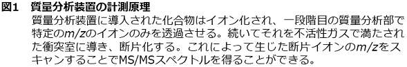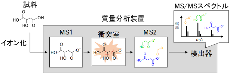 代謝物の総体を計測する学問体系をメタボロミクスと呼ぶ。メタボロミクスでは、感度良く多成分の一斉分析が可能な質量分析法 (mass spectrometry, MS) が汎用される。クロマトグラフィーと組み合わせて利用されることが多く、カラムにて物性の違いで分離した成分を順次質量分析装置に導入し、イオン化することで質量電荷比(m/z)を計測する (図1)。近年では質量分析装置の精密質量精度が格段に向上し、計測対象の分子式をある程度絞り込むことが可能となっている6)。ただし、対象物質の構造 (化学結合) を解析する核磁気共鳴法とは異なり、質量分析装置が計測するのはイオンの質量である。対象物質の構造を推定するためには、計測したイオンを質量分析装置内で開裂させ、その断片イオンの質量電荷比をスキャンして得たMS/MSスペクトル (より正確にはプロダクトイオンスペクトル) を取得する (図1)。この時の断片イオンのパターンは元の構造に特有なので、パズルのピースのように断片イオンを組み立てることで元の構造を推定することができる。この開裂前後のイオンを100 msec程度で高速スキャンすることで、1ランの分析から約5000 ~ 10000にものぼるMS/MSスペクトルを得ることができる。このようにあらかじめ標的を定めることなく、網羅的な解析を行う手法を、従来の標的限定型のターゲットメタボロミクスと対比して、ノンターゲットメタボロミクスと呼ぶ。この方法を駆使することで、想定していない新たな代謝物の発見が期待できる。