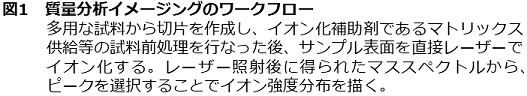 MSIのコンセプトは試料表面での直接質量分析である。試料表面に存在する分子をMALDIでイオン化し質量分析部で検出することにより、強度分布をマッピングできる。MSIのワークフローを図1に示す。試料は、動物、植物および食品でも対応が可能である。ただし、すでに述べた通り、MSIは試料表面で質量分析を行うため、試料採取が必要となる。例えば、ヒト試料を対象とする場合には、手術検体や生検により採取され、動物試料であればマウスなどのげっ歯類から臓器や腫瘍組織を採取する。採取された試料は、一般にドライアイスや液体窒素を用いて凍結されるが、分子の拡散や流出を防ぐため通常化学固定などは行わず、試料採取後、迅速に凍結を行う。凍結された試料は、クライオミクロトームを用いて厚さ5-20µm (試料の性状によるパラメータとなる) で凍結切片を作製した後、導電性を有する透明なガラスプレートに載せられる。ここで用いるガラスプレートとして、通常インジウムスズ酸化物でコーティングされたITOガラスを使用する。その後、イオン化補助剤である「マトリックス」を試料表面に供給し、MALDIを用いて分析を行う。分析では、組織表面にデータ取得点を設定し、その位置情報とともに各点でマススペクトルを取得する。なお、マススペクトルとは横軸が質量をイオンの価数で除したm/z、縦軸がイオン強度で表されたグラフデータである。