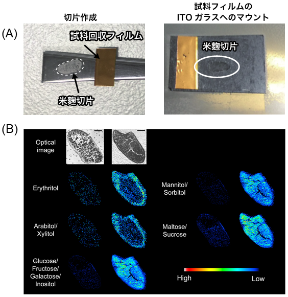 本実験では、精米歩合70%の山田錦の蒸米と米麴を用いた。これらの試料は非常にもろいことから、クライオミクロトームで切片を作製し、得られた切片を粘着性クライオフィルムにて回収した。切片作製において、それぞれの米粒は4%カルボキシメチルセルロースを用いて包埋後、−80℃で凍結させた。切片の厚みは20μmとし、得られたフィルムは松浪ガラス製ITOコートガラス (MASコート無し、表面抵抗100 Ω/m2) に3Mより購入した導電性両面テープを用いて固定した (図2A)。