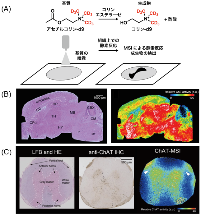 以下では野生型マウス脳と脊髄を用いて,アセチルコリンエステラーゼ (acetylcholine esterase: AChE) ならびにコリンアセチルトランスフェラーゼcholine acetyltransferase:ChAT) の活性分布の可視化を試みた.AChEは,アセチルコリンを基質としコリンと酢酸に分解する酵素であり、ChATはその逆反応としてアセチルCoAとコリンからアセチルコリンを合成する.したがって、AChEの活性を検出する場合にはアセチルコリンを試料表面に供給し、分解産物であるコリンを検出すればいい。ただし、内在性のコリンと区別しなければならないため、基質として重水素ラベル化されたアセチルコリン-d9を用い、コリン-d9を検出することにした (図3A)。ChATの場合は、その逆反応であるためコリン-d9とアセチルCoAを供給しアセチルコリン-d9を検出した。ここで、ChAT活性のイメージングに際し、合成されたアセチルコリン-d9は速やかにAChEにより分解されるため、基質供給の前にコリンエステラーゼ阻害剤であるフィソスチグミンを供給した。なお基質を含め全ての試薬の供給はマニュアルスプレーで行った。マトリックスは、α-シアノ-4-ヒドロキシケイ皮酸 ( α-CHCA,シグマアルドリッチ) を用い、その供給にはiMLayer (島津製作所) による蒸着とα-CHCAのスプレー噴霧を組み合わせた9)。