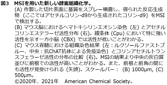 組織内での酵素分布を知る方法として、免疫組織化学 (immunohistochemistry: IHC) が一般的に用いられている。IHCでは、酵素の存在は可視化できるがその活性を知ることはできない。IHCでは得られない酵素活性分布を可視化する手法として、酵素組織化学が古くから知られている7,8)。酵素組織化学では、試料表面へ基質を供給し、内在性の酵素反応により産生された物質に対し、呈色反応を行うことで可視化する。既存の酵素組織化学では、この呈色反応のステップに汎用性があるとは言い難い。すなわち、呈色反応のステップを都度、設計する必要があることから、酵素組織化学自体の汎用性が低いと言える。ここでは、これらの課題を解決するために酵素反応で産生された分子をMSIで可視化する方法を検討し、マウス脳ならびにマウス脊髄に適用した。