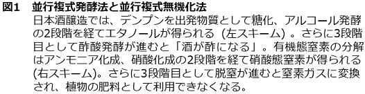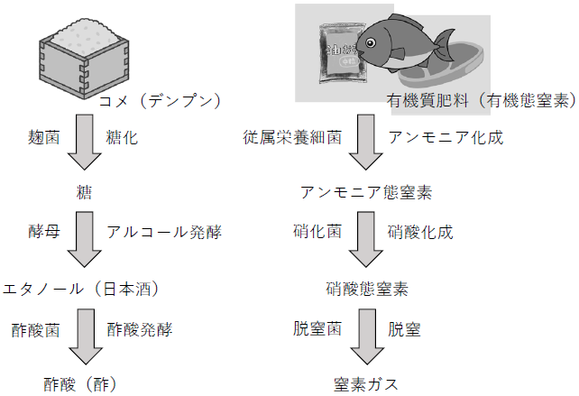 筆者は、アンモニア化成と硝酸化成の2段階の分解が、ある微生物反応と似ていると感じていた (図1)。日本酒の醸造過程だ。日本酒造りは、デンプンを糖に変える糖化と、糖をエタノールに変換するアルコール発酵の2段階で進む。この2つの分解反応が同時並行的に進むことから、並行複式発酵法と呼ばれている5)。そして、酒造りで注意しなければならないのは、第3の反応、酢酸発酵だ。エタノールが酢酸に変わる酢酸発酵は、「酒が酢になる」と言われるように、酒造りでは回避する必要のある反応だ。そして、この「第3の反応を防ぐ必要がある」という点でも、土壌中の窒素分解は似通っている。アンモニア化成、硝酸化成の2段階の反応を経た後、第3の反応である脱窒が起きると、せっかくの植物に好適な養分である硝酸が、窒素ガスに変換されてしまう。植物に養分を効率よく与えるには、第3の反応を抑える必要がある。