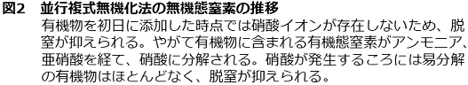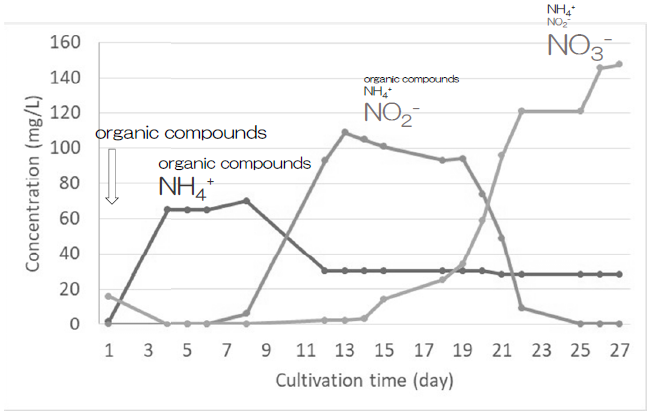 しかし筆者の発見した培養法だと、有機物 (鰹煮汁など、C/N比11以下の窒素含量の高いもの) の添加は少量 (1 g/L以下) かつ、培養初期にしか加えない。これにより、有機物が残存する過程では硝酸はまだ生成しておらず、硝酸が生成し始めるころには有機物は分解されている (図2)。こうして、硝酸イオンと有機物の同時併存が起きないように工夫することで、脱窒を抑えることに成功した。水中でアンモニア化成、硝酸化成を同時並行的に進めるこの手法は、日本酒醸造の発酵法になぞらえ、並行複式無機化法 (multiple parallel mineralization、MPM) と呼んでいる1)。
