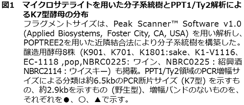 その結果、K7グループ株に特徴的なTy2に相当する約6.5 kbのPCR産物サイズを示すもの、PPT1遺伝子の大きさ約2.9 kbを示すもの、増幅バンドのないものの3パターンの分離酵母を確認することができた。野生酵母62株のうち32株がK7型を示し、これらの多くは分子系統樹において清酒酵母クラスターおよび野生酵母②クラスターに属した。また、2.9 kbの増幅を示す株は、ワイン酵母クラスターや分離酵母①クラスターに分布する傾向があった。例外も複数見つかり、1) F23は野生型の2.9 kbであるにもかかわらず、清酒酵母クラスターに属した。2) これまでの研究で報告されていないPPT1/Ty2領域の増幅が確認できない菌株を4株 (F19,F20,F32,F44) 確認することができた。