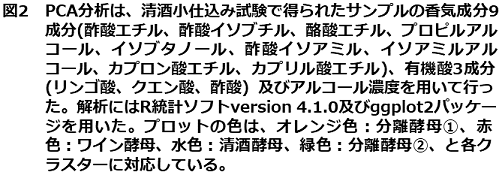 分離酵母は、分離酵母のみからなる独立した2つのクラスター (分離酵母①クラスター、分離酵母②クラスター)、清酒醸造に用いられるきょうかい酵母と分離酵母によって構成されるクラスター (清酒酵母クラスター)、醸造用ワイン酵母と分離酵母によって構成されるクラスター (ワイン酵母クラスター) の4つの主要なクラスターを形成した。