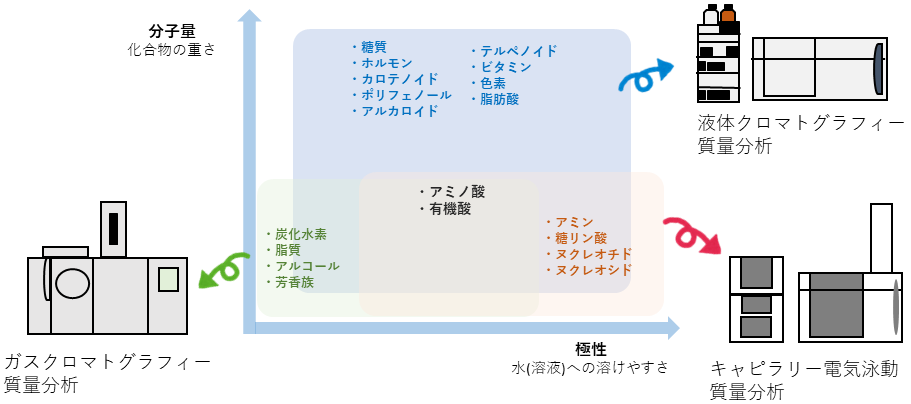 図1 質量分析装置によるメタボローム解析に用いられる分離方法と測定できる分子の関係