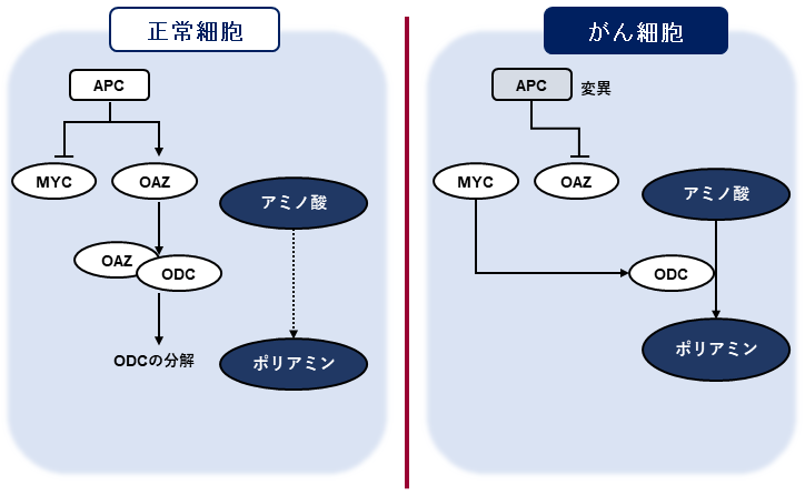 ポリアミン合成の律速酵素はODCである。がん抑制遺伝子APCの下流にMYCが位置し、そのMYC遺伝子の更に下流に位置する (図3) 26)。APC遺伝子の変異によるMYCの活性化はアデノーマの時点でも起こるために、がんだけでなくアデノーマにおいてもこれらの代謝の変化が起きうると考えられる27)。