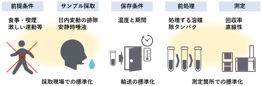 がんの早期発見には、血液などの体液中からがん患者に特異的にみられるバイオマーカー物質を高感度に検出する技術が必要である。著者らは唾液中の代謝物でがん患者に特異的に、濃度が変化する物質について質量分析装置を用いて検出し、その精度を検証する臨床研究を実施してきた。唾液は痛みがなく採取することができることや尿に比べて採取場所も限定されないことなど、様々なメリットがある。一方、採取方法や保存方法を統一しなければバイオマーカーの値が変動してしまう問題がある。検体全体として濃度の差異も発生し、更に唾液の場合では痰が含まれることにより粘液性や白濁度合いが高くなることなどもあるため、これらの様々な影響を最小化する技術開発も必要となる。ここでは、がんのマーカーを事例として唾液検査開発の現状と課題に関して紹介する。