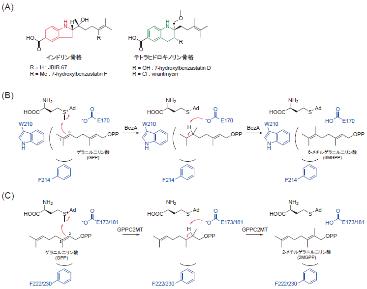 BS類はp-アミノ安息香酸とゲラニル二リン酸 (GPP)を前駆体に生合成される天然物の総称であり、インドリン骨格やテトラヒドロキノリン骨格といったユニークな二環性骨格を有しているものがある (図1A)。我々は特に、ユニークな二環性骨格の形成機構を解明すべく、本化合物の生合成研究を行ってきた1)。この過程で、GPPのC6位にメチル基を転移するという、これまでに知られていない位置特異性を有する新規GPPメチル化酵素GPPC6MT (BezA) を発見した (図1B)。GPPなどのプレニル二リン酸は通常、環化3,4)や転移5)などの反応を受けた後に、修飾されることが一般的で、これらの反応の前に修飾が生じる例は非常に稀である。しかし、BezAのように、生合成反応の初発反応として、GPPなどのプレニル二リン酸をメチル化する酵素はいくつか報告されていた。例えば、methylisoborneolの生合成において、GPPのC2位へのメチル基転移酵素 (GPPC2MT) が2種の放線菌から見出されていた (図1C、Streptomyces coelicolor A3(2)由来のScGPPC2MTとStreptomyces lasalocidi由来のSlGPPC2MT)6,7)。それ以外にも、イソペンテニル二リン酸 (IPP) やジメチルアリル二リン酸のメチル基転移酵素8-10)、ファルネシル二リン酸 (FPP) のメチル化とそれに伴う環化を触媒するメチル基転移酵素11)が見出されていた。GPPC2MTは結晶構造が報告されており、その反応機構がいくつか提唱されていたが5,6)、メチル基転移という比較的簡単な反応であるにもかかわらず、その詳細は未解明であった。また、メチル基転移酵素同士はアミノ酸相同性が低い12)という特徴から、BezAと他のメチル基転移酵素との基質認識機構の違いをアミノ酸配列ベースで解析することは困難であった。このような背景から、我々はBezAの詳細な分子機構の解明を試みた。