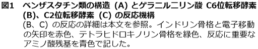 生物の生体内において、様々な代謝反応が効率的に行われている。これらの反応には様々な酵素が関与しているため、それぞれの反応を触媒する酵素を見出し、その機能を詳細に解析していくことは酵素研究において非常に重要な課題である。また、酵素反応は特異性が高く、穏和な条件で進行することから、バイオ触媒として様々な用途で産業利用される。そのため、天然の酵素の基質特異性改変や反応効率改善、耐熱性の付与などが求められ、酵素の機能改変を効率的もしくは合理的に行うことも酵素研究における重要な課題である。以上のような背景から、酵素の発見・詳細な機能解析は基礎科学的な知見を広げるのみならず、酵素の産業応用への足掛かりを与えることにつながると言える。本稿では、近年、我々がベンザスタチン (BS) 類 (図1A) の生合成研究1)から見出したゲラニル二リン酸C6位メチル基転移酵素 (GPPC6MT) であるBezAの構造解析・計算化学を利用した詳細な反応機構解析および構造に基づく合理的な機能改変の成果2)について概説する。