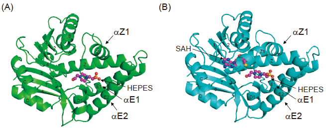 次に、X線結晶構造解析により、BezAの基質認識能や反応機構の解明を試みた。X線結晶構造解析においては、結晶化に用いたバッファー成分のHEPESが基質ポケットに入った構造 (apo-BezA, PDB ID: 7FBH) と、HEPES とS-adenosyl-L-homocysteine (SAH) の2 つの分子が基質ポケットに入った構造 (BezA-SAH, PDB ID: 7FBO) を取得することに成功した (図2A, B)。一方、基質であるGPPやメチル基ドナーであるSAMとの共結晶を取得することはできなかった。GPPとの共結晶が得られなかったのは、HEPESがGPPのポケットに強固に結合しているためであると考えられた。実際に、HEPES溶液中ではBezAのメチル化活性を見ることができなかったことからもHEPESが基質ポケットに強く結合していることが示唆された。