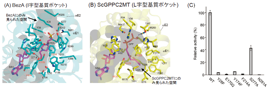 得られたBezAの全体構造に着目すると、BezAは通常のメチル基転移酵素同様、Rossmann foldをとっており、アミノ酸配列の相同性は約20%程度と低いものの構造が解明されていたScGPPC2MT (PDB ID: 3VC2) およびSlGPPC2MT (PDB ID: 4F86) とも非常に類似した構造をとっていることが明らかになった (3VC2、4F86それぞれに対して、RMSD 1.51 Å、1.15 Å)。しかし、全体構造をより詳細に見ると、BezAのαE1、αE2ヘリックスがGPPC2MTのものより長く、基質ポケットが縦に長くなっていた。また、BezAの構造間でも、BezASAHの構造において、αZ1ヘリックスがapo-BezAのものよりも長く、基質ポケットを閉じるように配置されていた (図2A, B)。さらに、このαZ1ヘリックス中の28番Tyr (Y28) と基質ポケットに存在する174番Tyr (Y174) が水素結合により相互作用することでαZ1ヘリックスが固定されていることがわかった (図3A)。実際にこれら2つのTyrのうち一方をPheに置換すると大幅に活性が減弱した (図3C)。このことから、反応時に基質ポケットを閉じるためにY28-Y174の相互作用が重要であることが明らかになった。