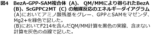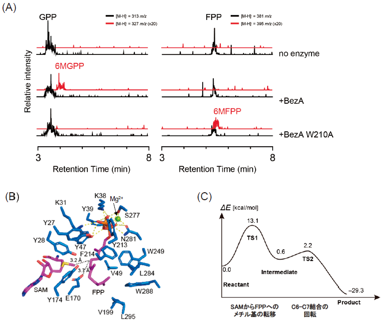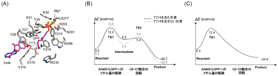 まず、BezAと基質であるGPP、補酵素であるSAMとMg2+のドッキングを行い、これらの複合体モデルを得た (図4A)。この複合体において、Mg2+はS277とN281を介してGPPの保持に関与していることが示唆され、実際に、これらのアミノ酸の置換によりメチル化活性が減弱もしくは消失していた (図3C)。次に、この複合体構造をもとに30 ns の分子動力学 (MD) シミュレーションを行ったところ、SAMのメチル基とGPPのC6位がメチル基の転移が生じうる距離に存在していた。また、ScGPPC2MTについても同様にMDシミュレーションを行ったところ、SAMのメチル基とGPPのC2位がメチル基の転移が生じうる距離に存在していた。最後に、量子力学/分子力学 (QM/MM) 計算により、反応のエネルギー計算を行った。その結果、BezAではtransition state 1 (TS1) を経由してメチル基がGPPに転移し、C7位にカルボカチオンを有するintermediateが形成されること、transition state 2 (TS2) を経由してC6位のプロトンがE170に引き抜かれ、product (6MGPP) が形成されることが明らかになった (図4B)。このとき、初期状態からTS1への活性化エネルギーは12.4 kcal/mol、intermediateからTS2へは0.2 kcal/molであった。また、F214がカルボカチオンの安定化に寄与しているかを調べるため、F214を含めないでQM/MM計算を行ったところ、intermediateからTS2に至るまでの活性化エネルギーに大きな差がなく、F214が量子的な寄与をしていない、つまり、カルボカチオンの安定化のためのカチオン-π相互作用が存在しないことが示唆された。このことより、F214は物理的にGPPを基質ポケット内で固定するために存在していると考えられた (図4B)。一方、ScGPPC2MTについてもQM/MM計算を行った結果、BezAと同様の機構で反応が進行することが明らかになった。しかしながら、ScGPPC2MTではTS1への活性化エネルギーはBezAと類似しているものの、intermediateやTS2が見られず、GPPのC2位へのメチル基の転移と同時にC2位のプロトンがE173へと転移していることが示された (図4C)。以上の解析から、BezAとGPPC2MTの反応機構の詳細を明らかにすることができた。