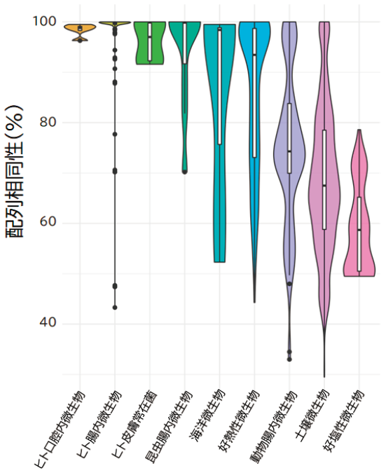 図3はある酵素をbit-GEMから探索し、公共データベースに登録されている遺伝子との配列相同性を検証したものである。口腔内や腸内などヒト由来微生物叢から取得された遺伝子は公共データベースとの高い相同性を示す一方、土壌等の環境微生物由来の遺伝子では配列相同性が低いことが見て取れる。他の様々な酵素を対象とした場合でも同様の傾向が見られる。これは、ヒト共生微生物に比べて環境微生物が多様であることを示しているだけでなく、既存のゲノム解析手法ではその配列多様性を未だ充分に捉えきれておらず、公共データベースに登録実績のない未知の遺伝子がまだまだ膨大に存在していることを示している。