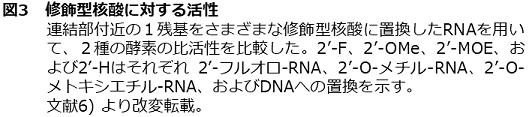 酵素を用いたsiRNA製法は効率的な製法として期待されるが、実用化には課題もあった。多くのsiRNAでは生体内での安定性や標的のRNAへの親和性向上のため、2’-O-メチル基や2’-フルオロ基で修飾されたヌクレオチドが使用されている。既知のオリゴ核酸リガーゼは、このような修飾型RNAに対する活性が低く、効率の良い連結が難しかった。我々は、オリゴ核酸の酵素的製法の実現に向けて、酵素の基質特異性の改変を試みた6,7)。