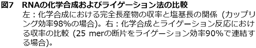 これらの問題を解決して、修飾等のバリエーションに富んだ長鎖RNAを高効率に生産するためには、比較的化学合成が容易である短い鎖長のRNAを複数作製し、リガーゼ等の酵素で連結 (ライゲーション) することが有用であると我々は考え、製法の開発に取り組んできた。例えば完全長産物量61.6%の効率で合成できる25 merの複数RNA断片をライゲーションした場合、その反応点でのライゲーション効率が90%であれば、50 mer合成では55.4% (61.6% × 0.9 = 0.554)、100 mer合成では44.9% (61.6% × 0.93 = 0.449) となり、連続的に化学合成した場合と比較してそれぞれ1.5倍、3.3倍の効率上昇となる (図7)。RNA化学合成とライゲーション反応を組み合わせることによって、計算上顕著な高効率化が可能であり、さらに高効率化だけではなく、多数のRNAをライゲーションさせることによって、今までは合成が著しく困難であった150 mer以上の部分修飾RNAの合成も可能になる。
