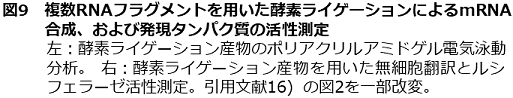 もう一つは、20以上の短鎖RNA断片を連結させ、長鎖を作製したものである。図8下段の様式を応用して、トゲオキヒオドシエビ[Oplophorus gracilirostris]由来ルシフェラーゼ (NanoLuc®) をコードした全長500 merを超えるmRNAの合成に挑戦した (図9、左)。この合成したmRNAを用いて無細胞翻訳系でタンパク質を合成し、ルシフェラーゼ活性を確認することに成功した (図9、右)16,17)。