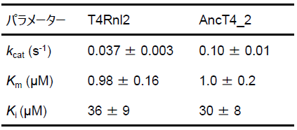 さまざまな濃度の天然型の二本鎖RNAに対するAncT4_2とT4Rnl2の活性を測定し、これらの酵素の速度論的パラメーターを比較した。オリゴ核酸リガーゼの先行研究では、基質オリゴ核酸による反応への阻害が報告されており10)、本研究においても基質による阻害モデルに基づいて各パラメーターを算出した。RNAに対するミカエリス定数 (Km) とRNAによる阻害定数 (Ki) は、2つの酵素で同等であった。一方、AncT4_2のターンオーバー数 (kcat) および触媒効率 (kcat/Km) は、T4Rnl2の2.5倍以上に向上しており、酵素活性が向上していた (表1)。