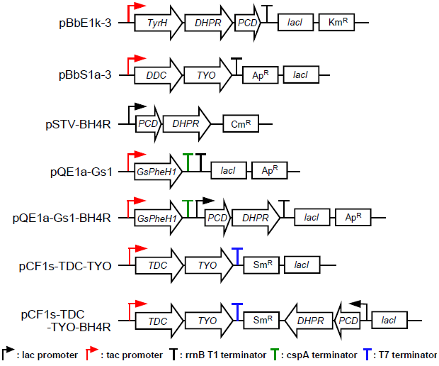 本プラットフォームの有用性をDOPA生産で評価した9)。2節で使用したマウス由来TyrH遺伝子とBH4再生関連遺伝子をオペロンとして発現するプラスミドpBbE1k-3 (図4) を導入した結果、1.0 g/L (5.3 mM) のDOPA生産が確認された。このように、プラスミドフリーなプラットフォームでも、1 g/LのTyr誘導体生産が可能であることがわかった。また、Tyrの蓄積が認められたことから、DOPA合成反応が律速ステップであった。