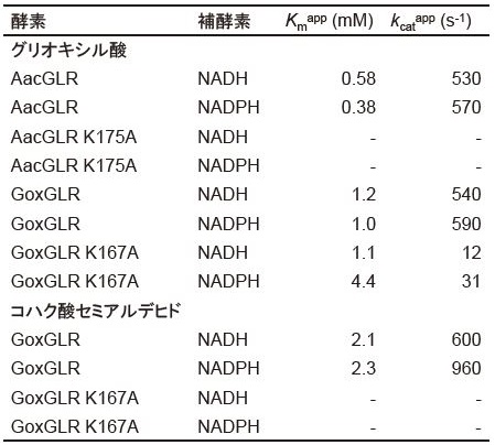 一方で、GoxGLRはグリオキシル酸およびコハク酸セミアルデヒドの両方に対して高い還元活性を示した8)。どちらの基質に対しても最適温度は30℃であり、最適pHは6.5 (40 mM リン酸緩衝液) であった。pH 4.0とpH 6.5の両方の条件でAacGLRとGoxGLRの活性測定を行ったが、どちらのpHにおいてもGoxGLRはグリオキシル酸とコハク酸セミアルデヒドの両方に還元活性を示したが、AacGLRはグリオキシル酸にのみ還元活性を示した。このことは、その高い配列相同性にもかかわらず、GoxGLRとAacGLRでは基質特異性が異なることを明確に示している。さらに、0.15 mMのNADHまたはNADPH存在下におけるGoxGLRのグリオキシル酸に対するみかけのKm値はそれぞれ1.2 mMと1.0 mMであり、みかけのkcat値は540 s-1と590 s-1であった (表1)。一方で、コハク酸セミアルデヒドに対するみかけのKm値はそれぞれ2.1 mMと2.3 mMであり、みかけのkcat値は600 s-1と960 s-1であった。以上の結果、GoxGLRはグリオキシル酸とコハク酸セミアルデヒドの両方に対して同程度の高い還元活性を示すことが明らかとなり、AacGLRと同様にNAD(P)Hへの特異性が低いことを示している。