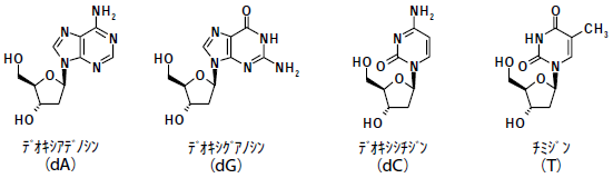 4種のデオキシヌクレオシド、デオキシアデノシン (dA)、デオキシグアノシン (dG)、デオキシシチジン (dC)、チミジン (T) は、遺伝子 (DNA) を構成する化合物である (図1)。