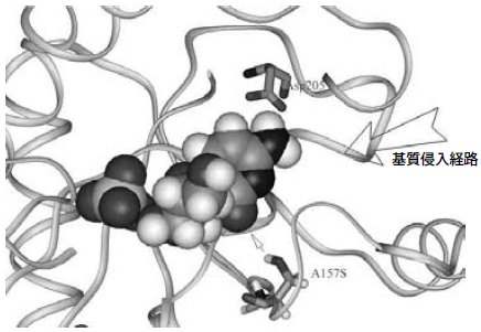 これら知見と、PNPaseの立体構造データ9)およびすでに提案されているPNPaseの反応機構を10)もとに157位の置換効果を解析した。計算から求めたPNPaseとdCの結合モデルと157位の位置関係を図11 に示した。PNPaseの反応では、205位のアスパラギン酸とプリン塩基の7位の窒素との水素結合が重要とされている。205位のアスパラギン酸は、シトシンの反応においても4位のアミノ基と水素結合を形成すると考えられる。ウラシルやチミンは4位がカルボニル基であることから水素結合を形成できず、反応性が低いと考えられる。157位のアラニンがセリンに置換されると、シトシンの2位のカルボニルとの距離が3.5Å程度になると計算され、水素結合が形成され得る距離になる。この相互作用により、シトシンが反応性の高まる配置に誘導されると解釈すると、157位がバリンに置換されると活性が低下することに納得がいく (図12)。
