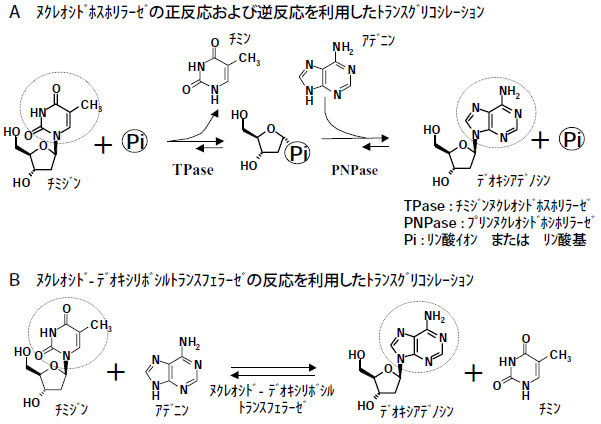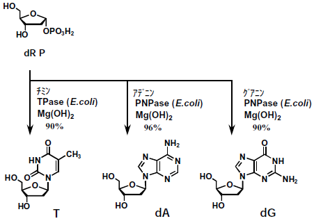 大腸菌由来のプリンヌクレオシドホスホリラーゼ (PNPase: EC 2.4.2.1) を利用して、dRPとプリン塩基から、デオキシヌクレオシドを合成する反応は古くから知られていた。しかし、平衡反応であるため、高収率でデオキシヌクレオシドを得るためには、反応条件を工夫する必要があった。特に、水に難溶のグアニンを基質とするdG合成反応では反応収率が上がらなかった。