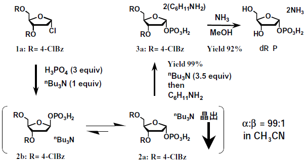 ヌクレオシドホスホリラーゼの基質となるのはα体 (図4化合物dRP) のみであり、α体 (図4化合物2aおよび3a) を選択的に合成することが必要とされた。化合物1を塩基存在下にリン酸と反応したところ、縮合反応は進行するもののアノマー位の立体選択性はみられなかった (アノマー比2a:2b=1:1)。