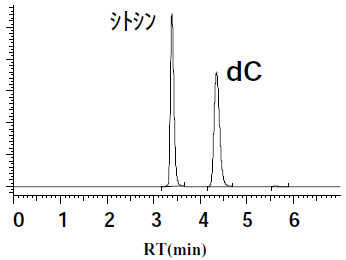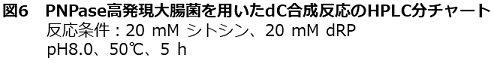 あるとき、dAやdGの合成検討に用いていた大腸菌由来PNPaseを高発現させた大腸菌をスクリーニングにかけてみたところ、極微量ながらdCが生成することを見出した (図6)。再現性を確認すると、なぜか冷蔵庫で長期保管した菌体を触媒としたときだけdCが生成することがわかった。フレッシュな菌を用いた場合は、生成物としてウラシルやデオキシウリジン (dU) だけが検出された。