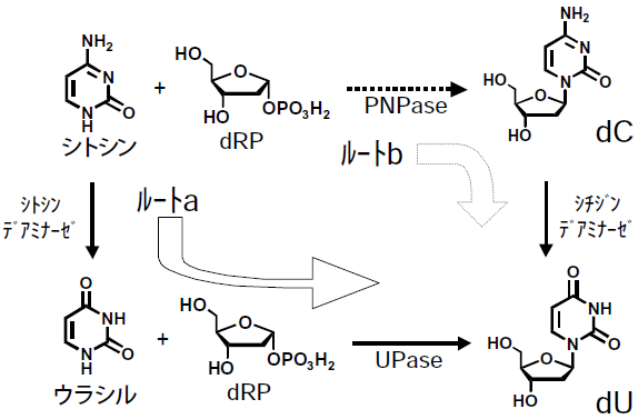 ウラシルやdUが生成する現象は、他の微生物をスクリーニングしたときにも見られていた。これは、夾雑するデアミナーゼ類により、シトシンがウラシルに変換され、さらにウラシルとdRPがUPaseによりdUに変換されるからだと解釈していた (図7ルートa)。大腸菌由来PNPaseの高発現株の結果から、シトシンとdRPがPNPaseによりdCに変換され、dCがウリジンデアミナーゼによってdUに変換されるルートがあるのではないかと思いついた (図7ルートb)。