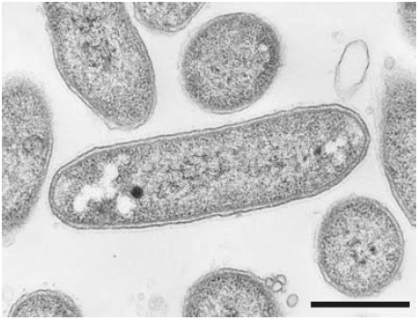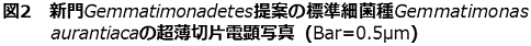 国内初の「新門」の提案の標準菌株となったG. aurantiaca (図2) もこのような研究の中で発見されたものである。本細菌は、従来の方法に比べ長い培養時間 (2週間以上) の後に現れてくる増殖速度の遅い (正しくはコロニー出現時期が遅い) ものを選択するという手法を用いて、廃水処理システム中の活性汚泥より単離されたものである。分離された新単離株は、細胞の直径が0.7µm、長さは2.5-3.2µm程度の酸素呼吸によって生育するという形態もその生育条件も一般的と思われる菌株であったが、16S rRNA遺伝子配列に基づく系統解析からいかなる既存菌株とも配列相同性が低く、系統的に大きく隔たっていることが明らかとなった。このような系統分類学的特殊性を受けて、本菌株を完全に新たな分類門 (Gemmatimonadetes phyl. nov.) を代表する新属新種、Gemmatimonas aurantiaca gen. and sp. nov.として提案し、受理された6)。(ここで述べたもの以外に、我々の研究グループが中心となって分離と提案を行った新属・新種に関しての主要な論文7-13)を文献情報のみではあるが、文末 (文献) に列記した。系統的新規性に関しては上記のものほどではないが、みな興味深い生理学的特徴を持っている。)