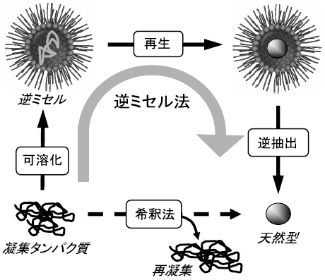 逆ミセル法は、逆ミセル内水相に変性タンパク質を個々に分離し、タンパク質が自発的に機能再生する場を提供することでリフォールディングを達成するというものである (図2)。つまり、逆ミセルへの可溶化により擬似的な無限希釈状態を作り、変性タンパク質の再生過程におけるタンパク質相互作用を抑制しようというアイデアである。この方法は大きく3つの段階から構成されており、変性タンパク質を逆ミセルに取り込む「可溶化」、変性タンパク質のリフォールディングが行われる「再生」、そして逆ミセルから再生タンパク質を回収する「逆抽出」から成る。Hagenらは変性リボヌクレアーゼA (RNase A) 溶液を調製し、アニオン性界面活性剤di-2-ethylhexyl sulfosuccinate sodium salt (AOT) を溶解した有機相 (イソオクタン) との液液抽出により変性タンパク質の可溶化を試みた。変性剤溶液に溶解したRNase A溶液を、アニオン性界面活性剤AOTに溶解したイソオクタン溶液と二相接触し、変性RNase Aを溶解した逆ミセルを調製した。ここに酸化還元試薬 (GSSG/GSH) を添加しジスルフィド結合の再結合を促進し、タンパク質の再生反応を行った。これにより、変性溶液中では完全変性状態にあったRNase Aは、逆ミセル中において活性回復を果たすことができた。しかし、変性RNase Aを逆ミセル溶液に取り込む段階で、変性剤が逆ミセル形成の阻害となりRNase Aの抽出率が非常に低いという問題点があった。