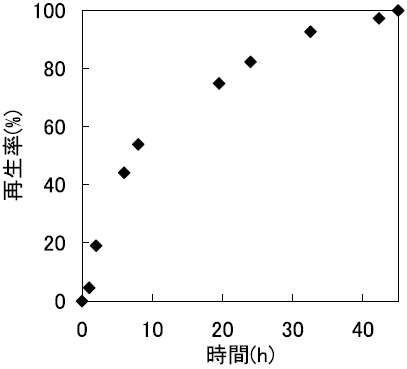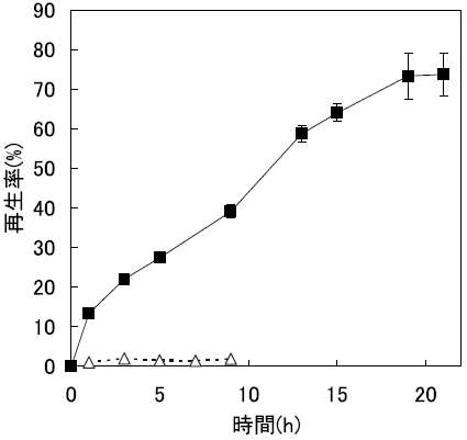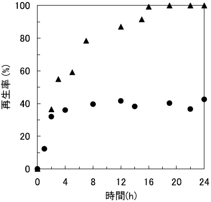 まず、逆ミセル法と希釈法によるRNase A封入体のリフォールディング挙動の違いを経時的に調べた17)。その結果、逆ミセル法による操作では約18時間で完全に再生が達成された。一方、希釈法では再生率は40%程度にとどまり (図7)、凝集体の形成が目視により確認されたことから、大部分は水溶液に不活性型として蓄積されたことが示唆された。すなわち、逆ミセル系は、インクルージョンボディに対しても有効に機能することが示唆された。また、再生したRNase Aの逆ミセルからの回収についても、逆抽出操作を行うことによって、活性を保持したまま完全に回収することが出来た。以上の結果より、逆ミセルを用いたリフォールディング法が、インクルージョンボディや変性タンパク質のリフォールディング媒体として、一つの有望な選択肢であることが示された。