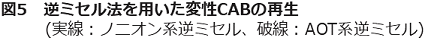また、変性carbonic anhydrase B (CAB) のリフォールディングをAOT及びノニオン性界面活性剤 (tetraethylene glycol dodecyl ether) 系逆ミセルで行ったところ14)、CABのリフォールディングはAOT系では促進されなかったのに対し、ノニオン性逆ミセル系では20時間後に約80%の再生率を得た (図5)。同スケールにおける希釈法では再凝集により約40%の再生率しか得られないことから、逆ミセルによる凝集抑制が再生率の向上に効果的に働いていることがわかる。この時、AOT系でリフォールディングが進行しなかったのは、界面活性剤とタンパク質間の相互作用が強すぎて、フォールディングに対して阻害的に働いたためと考えられる。一方、非イオン性界面活性剤からなる逆ミセルを用いるとリフォールディング効率が向上したことから、タンパク質の特性により界面活性剤をそれぞれ使い分けることによって、本手法が様々なタンパク質に適用可能であることが示唆された。