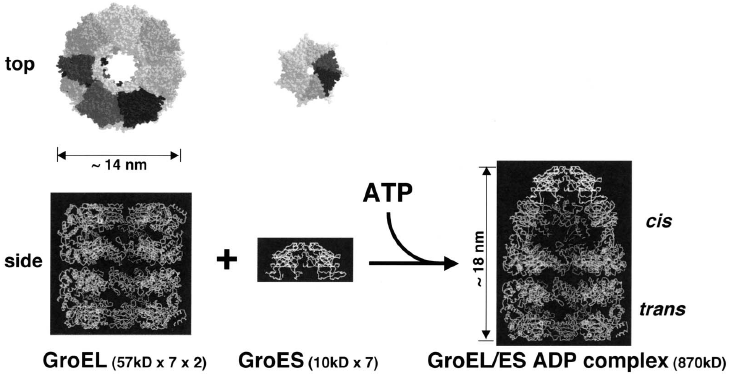 図1 GroEL、GroESおよびGroEL-GroES-ADP複合体の立体構造