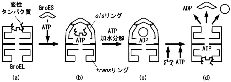 (a) GroELに基質となる変性蛋白質が結合する。(b) GroELにATPが結合すると、ATPが結合したリングにGroESが結合する。変性蛋白質が結合しているリングにATPが結合した場合、変性蛋白質はGroESのふたの下にできたGroELの空洞の中に閉じこめられる (cis複合体)。この過程はATPの結合で十分でATPの加水分解は必須ではない。基質蛋白質によっては、この段階でフォールディングが完成する場合もある (後述するが、このステップは2つに分割されると思われる)。(c) cis複合体中のATPが8秒程度で加水分解されてADP型のcis複合体となると、GroESの解離の準備が整う。(d) ADP型のcis複合体のcisと反対側のtransリングにATPが結合すると、GroESが解離する。同時に中に閉じ込められていた基質蛋白質およびADPも放出される。基質蛋白質はフォールディングが完了していなくても、放出される。