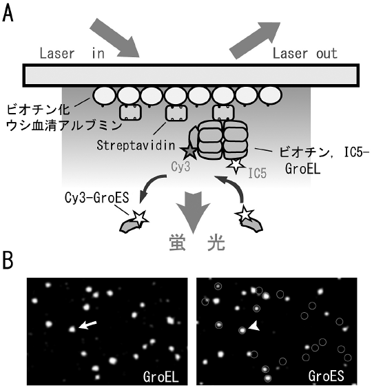 我々は図5Aに示すような方法で蛍光標識したGroELとGroESの結合・解離を観察した14)。1分子の蛍光色素のイメージングには全反射蛍光顕微鏡によるエバネッセント照明を用いた。この顕微鏡は照射面から約150 nmの領域しか励起しないため、背景光が劇的に減るだけでなく、スライドガラス表面に固定した蛍光標識蛋白質を局所励起できるという利点をもつ。まず、蛍光色素 (IC5) で標識したGroELを固定して位置を決定しておく (図5B左)。続いて、別の蛍光色素 (Cy3) で標識したGroESをATP存在下で加え、顕微鏡観察する。GroELに結合していないGroESはブラウン運動が激しいため蛍光スポットとならないが、GroESがGroELに結合すると輝点として観察できる (図5B右)。このような実験系で、単一のGroEL分子にGroESが結合し、そして解離する様子が初めて明らかとなった。