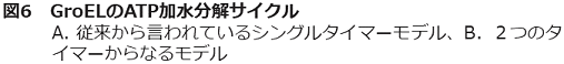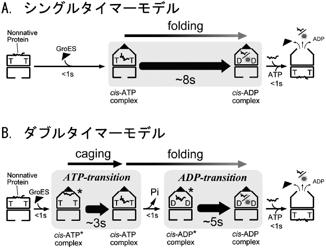 さらに1分子研究に付随して慎重に生化学実験をやり直した結果もタイマーが二つという上記の結論を支持したことから我々は2タイマーモデルを提案している15)(図6B) (詳細は省くが、従来の実験ではGroELのATP加水分解などの速度論を調べるのに基質蛋白質を入れていなかったが、変性蛋白質があると大きく速度論が異なることがわかった)。このモデルのポイントは、従来説では省略されていた変性蛋白質の取り込みを重要なステップとして位置づけたことである。従来の1つのタイマー説では、シャペロニンの空洞内でのフォールディングは説明できても、どのように変性蛋白質を取り込むか、という、ある意味ではシャペロニンの機能の一番重要な点が説明されていない。しかし、2タイマーモデルでは、変性蛋白質の取り込みには従来想定されていなかった中間複合体が存在することを示した。従来モデルではGroESと変性蛋白質は同じ結合部位を単に競合する。そのために、GroESは変性蛋白質を「はじき飛ばす」というイメージであったのに対し、2タイマー説では、GroESが結合したときにはまだ変性蛋白質はGroELのどこかに結合したまま、と考える (後述するように、生化学実験からもそのような中間体が示唆されてきている)。
