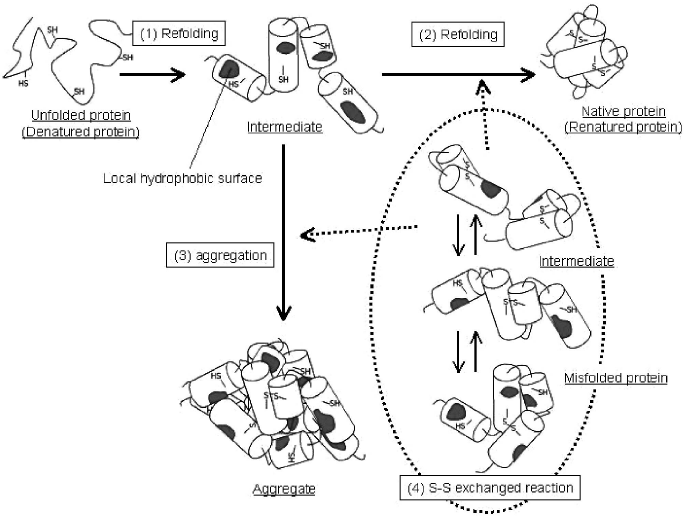 まず、従来から一般的に行われているリフォールディング法について、簡単に解説する。ほぼ全ての手法において、リフォールディングは、尿素や塩酸グアニジン (GdnHCl)、dithiothreitol (DTT) といった可溶化剤の濃度を下げることによって行われる。なぜなら、これらの可溶化条件下では、立体構造形成に必要な分子内相互作用も弱められてしまうため、タンパク質は天然型構造を形成できず、柔軟性の高い構造未形成状態となる5)。そこで、分子内相互作用および分子内S-S結合が形成できる濃度条件まで可溶化剤濃度を下げることによって、可溶化タンパク質のリフォールディングを誘導するというわけである。しかしながら、可溶化剤濃度の低下は、天然型構造の形成に必要な分子内相互作用を可能にするが、同時に、誤った分子内相互作用や分子間相互作用も可能にする。そのため、タンパク質のリフォールディングは、可溶化タンパク質から天然型への単一反応ではなく、ミスフォールディングや再凝集との競争反応となる。特に、可溶化剤濃度の低い条件においていったん形成された再凝集産物は、自発的に解離することはないため、再凝集反応は不可逆である5)。この不可逆的な再凝集反応は、リフォールディング収率の著しい低下を招くため、再凝集反応の抑制がリフォールディングの最大の課題である。