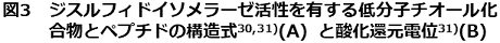 フォールダーゼを模倣した研究として、S-S交換反応を促進するジスルフィドイソメラーゼ (PDI) 様の機能を有した低分子量化合物が研究・開発されてきた。Leesらは、PDIの活性中心にあるチオール基のpKaに着目した研究を行った30)。PDIの活性中心にあるCXXCモチーフのチオール基のうち、溶液中に露出しているチオール基は、pKaが低く (pKa =6.7)、基質タンパク質のS-S結合に対する求核性が高いことが知られている。そこで、システインらの脂肪族チオールよりもpKaが低い芳香族チオール (図3 化合物1) を開発し、変性還元リボヌクレア-ゼAのリフォールディングに添加剤として用いた。その結果、S-S交換反応速度が速くなり、リフォールディング速度が大きく向上することを報告した。一方、Rainesらは、生体内においてタンパク質の酸化還元反応を触媒している酵素群の酸化還元電位に着目し、適切な電位を有する低分子量化合物 (図3 化合物2) およびペプチド (図3 化合物3) を、S-S交換促進試薬として開発した31)。これらの化合物を添加したところ、従来の酸化還元試薬を添加した場合と比較して、変性還元リボヌクレア-ゼAのリフォールディング収率は向上することが示された。