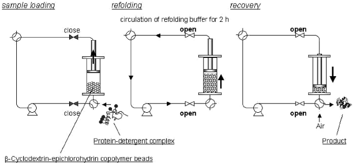 工業スケールへの応用を考えると、タンパク質のリフォールディング技術には、以下のような条件を満足することが望まれる。(1) 装置の大きさができるだけ小さい。(2) 工程数ができるだけ少ない。(3) 材料が再利用可能である。このような観点から、機能性添加剤を固相上に固定化する研究が盛んに行われている。なぜなら、添加剤の固相上への固定化は、カラムを用いた連続系リフォールディングシステムへの応用を可能とすることから、潜在的に装置のサイズを小さくでき、リフォールディング後の添加剤とターゲットタンパク質の分離精製工程を簡略化し、材料の再利用を可能にするという利点を有するからである。我々の研究グループでは、β-シクロデキストリンを含むポリマービーズ (β-シクロデキストリン-エピクロロヒドリンコポリマー) を用いて、ACA法を固相化することに成功した32)。まず、可溶化モデルタンパク質を界面活性剤水溶液で希釈することにより、界面活性剤との複合体を形成させ、次に、β-シクロデキストリンを含むポリマービーズ懸濁液を添加して、界面活性剤を包接除去した。このような二段階の操作により、モデルタンパク質である変性α-グルコシダーゼのリフォールディング収率を大きく向上させた。さらに、膨張層式カラム内でポリマービーズによる包接を行う反復回分系のACA法の構築も実現した (図4)。また、他のグループでは、久保井らは、リポソームを固定化したカラムに、変性・還元リゾチームを通すことによって100%の収率でリフォールディングに成功しており28)、PDI様活性を模倣した低分子量チオール化合物を固相上に固定化した研究も、数例報告されている33)。