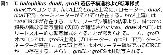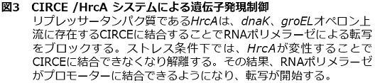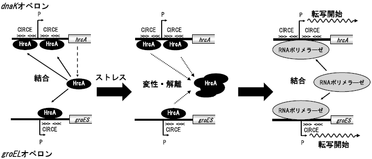 枯草菌などの研究では、dnaKおよびgroEL遺伝子の転写制御は、先に述べたとおりHrcAがStem-loop構造をとったCIRCE配列へ結合することにより負に制御されていることが示唆されている (図3)12)。T. halophilusにおいても同様の制御機構が存在すると考え、組換え体HrcAを用いてゲルシフトアッセイおよびビオチン化CIRCE DNA断片への結合実験を行った。その結果、HrcAがdnaK遺伝子クラスター上流およびgroES上流に存在するCIRCE部位に特異的に結合することが示された。また、ゲルシフトアッセイとCDスペクトル解析の結果より、熱ストレスと塩ストレスによってHrcAの立体構造変化が生じ、HrcAのDNAへの結合活性は失われることが明らかとなった。