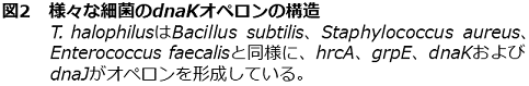 また、一部のグラム陽性細菌の中には、リプレッサータンパク質CtsRがClpファミリーの遺伝子のみならず、dnaKおよびgroELオペロンの遺伝子発現を制御しているものも存在する (図6)13)。Bacillusタイプの場合、dnaKおよびgroELオペロンの遺伝子発現はHrcAによって制御されているが、Staphylococcusタイプの場合は、dnaKおよびgroELオペロンの両方がHrcAとCtsRの二重制御を受けている。一方、Streptococcusタイプの場合は、groELオペロンのみがHrcAとCtsRによって二重に制御されている。Streptococcusタイプのもう一つの特徴として、dnaKオペロン上流にCIRCE配列が二つ存在するということが挙げられ、そのためにCtsRの制御を受ける必要がないと考えられている13)。T. halophilusはdnaKオペロン上流に二つのCIRCE配列を有しているが、groELオペロン上流にはCtsR結合配列は見出されておらず、必ずしもStreptococcusタイプとは言い難い。DnaK、GroEL、ClpB以外の分子シャペロンの転写制御機構を明らかにしていきながら、CIRCE配列が二つ存在する理由・意義については今後明らかにしていきたい。
