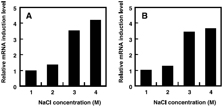 ノーザン解析によりそれぞれの分子シャペロン遺伝子の転写解析を行った結果、groES-ELはオペロンとして転写されていることが明らかとなった (図1)。また、このgroES-ELオペロンは4 M NaClを含む培地中で1時間培養すると、1 M NaClの場合に比べて約4倍転写増幅されることがスロットブロット解析により明らかとなった7)(図5A)。一方、dnaKおよびその近傍の遺伝子に関しては、dnaKに相補するプローブを用いたノーザン解析により、複数のmRNAの存在が確認され、ポリシストロン性の転写様式をとることが明らかとなった (図1)。また、T. halophilus菌体にとって最適な生育NaCl濃度である2 Mまでは大きな発現量の変化は見られなかったものの、3~4 M NaClにおいては、通常時の約3.5倍の転写量の増大が確認された8)(図5B)。これらの結果、分子シャペロンDnaKおよびGroELがT. halophilusの高塩濃度適応において何らかの重要な役割を果たしていることが示唆された。